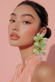 Delicate and dreamy, these Mint Blossom Earrings feature soft satin petals, golden bead accents, and cascading crystal strands. A whimsical touch of nature-inspired elegance, perfect for garden parties, weddings, or a fresh statement look.