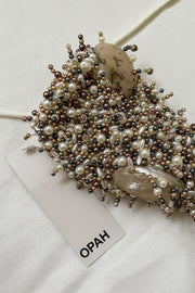 An ode to the ocean’s quiet magic, this ivory beige bikini is hand-embroidered with golden motifs of sea creatures and corals. Crafted on a stretchable base for comfort and structure, its front panel showcases over 48 hours of meticulous artistry, each thread shimmering like sunlight over the waves.